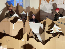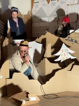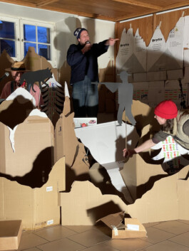 Für “felsenfest” lässt sich DIE VERMESSUNG von den Bergen zu Liedern inspirieren. Im Herbst 2023 verbrachten Sebastian Gisi, Olivia Ronzani und Ivo Schneider zwei Wochen in einer Hütte in den Zentralschweizer Bergen, schauten in die Ferne, bestiegen Gipfel, lernten über Permafrost und komponierten mit Stimme, Synthesizer, Piano und Text. Dabei sind professionell dilettantische Lieder entstanden, in denen von schmelzenden Gletschern, einstürzenden Bergen und der Romantisierung der Bergwelt gesungen wird. Après-Ski Hit, absurder Non-Sense und ein Gute-Nacht Lied folgen mit viel Humor aufeinander. In einer naiven DIY-Aesthetik zwischen barockem Theater, Bastelbogen und Kinderzimmer stehen die drei Musiker:innen. Um sie bröckeln die Berge und… der Wolf entkommt doch noch.